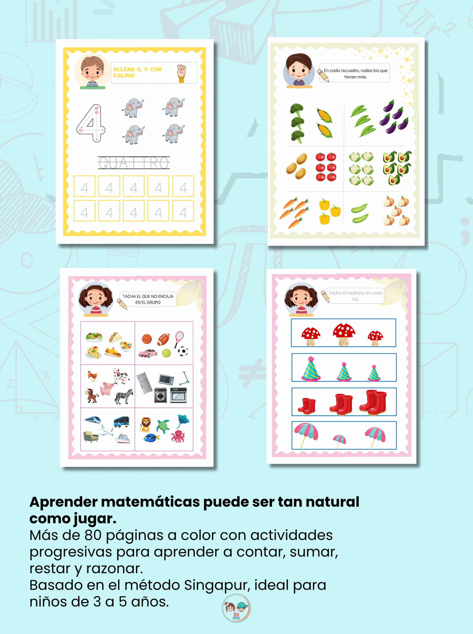 Un cuaderno claro y bonito para que tu peque empiece con las mates. A través de actividades visuales y progresivas, aprenderá a contar, sumar, restar y razonar sin tener que memorizar. Inspirado en el método Singapur, todo está pensado para que entienda lo que hace desde el primer ejercicio. Diseñado a color, limpio y fácil de seguir, ideal para usar con la ayuda de un adulto.